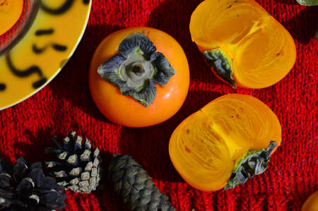 Bright juicy persimmon. Fruit whole and cut into halves. On a red woolen knitted background. There are pine and spruce cones.