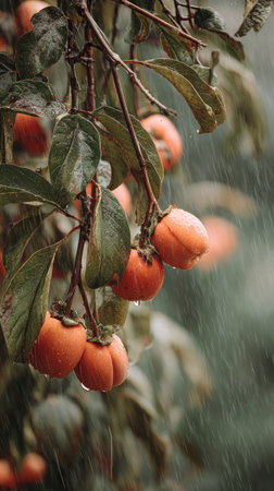 Persimmon in a storm, heavy rain pouring down, strong winds twisting their leaves, natural.