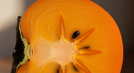 Orange persimmon, cut in half with the texture of seeds and pulp. Persimmon slices background close up, top view, macro