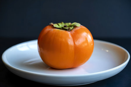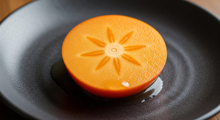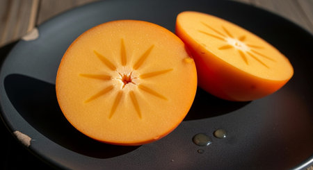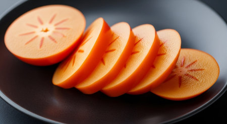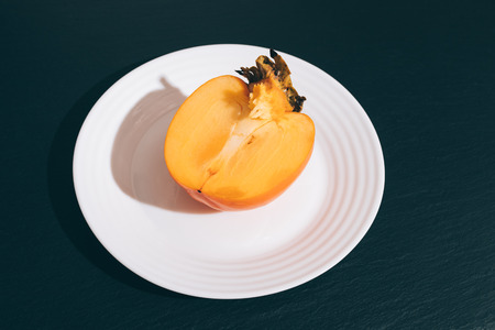 Sliced orange persimmon on a white plate on a black table