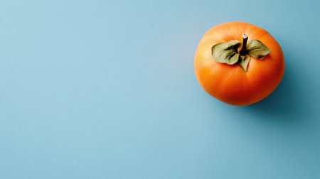 A single ripe persimmon fruit sits against a soft blue background, showcasing its vibrant orange hue and green leaf, ideal for food-related projects.