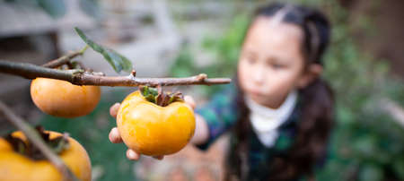Girl picking persimmons in the garden