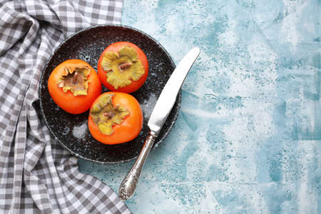 Plate with ripe persimmons on color background