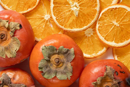 persimmon and dried orange slices as background, fruit background