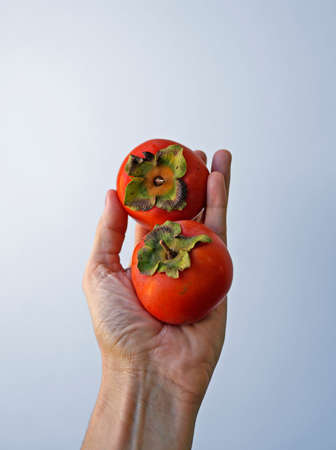 Persimmons on hand in a bright background