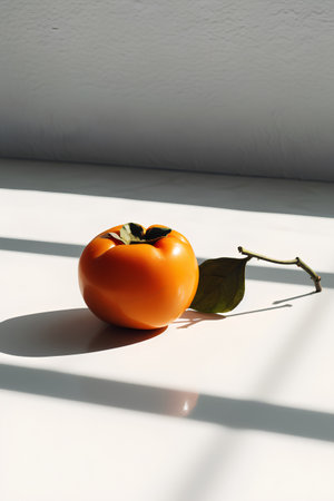Ripe persimmon on a white background with a shadow from the window