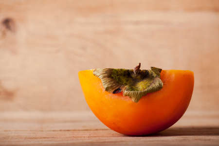 Slices of ripe orange persimmons on a wooden background. Orange autumn fruits.