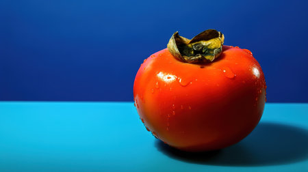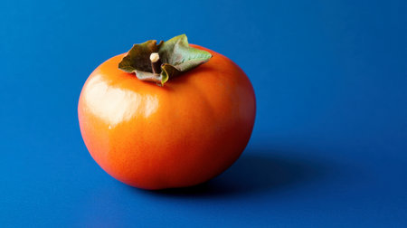A whole persimmon resting on a cobalt blue background, rich and festive.