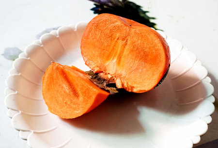 Close-up view of a juicy, ripe persimmon fruit cut in half and served on a white plate