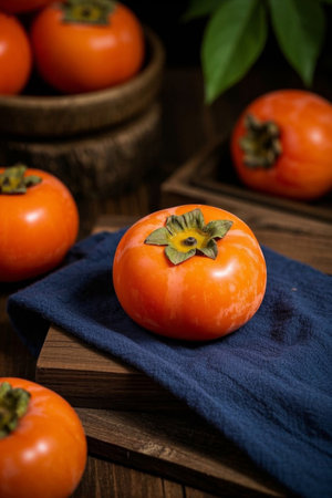 Fresh persimmon on a vintage wooden table