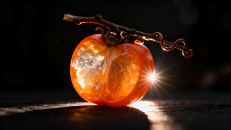 Ripe persimmon on a black background with sun rays.