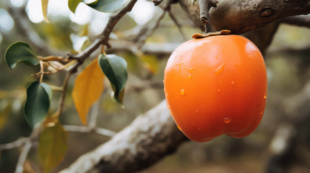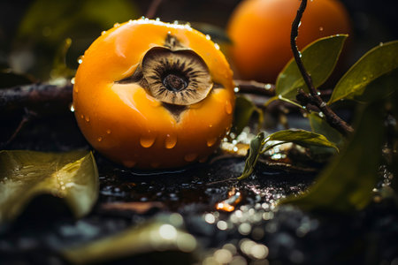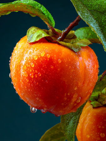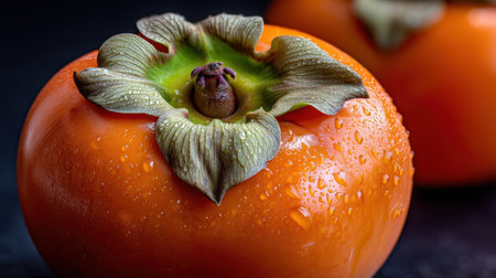 Discover the beauty of fresh persimmons adorned with raindrops on a dark background. This vibrant fruit embodies health and flavor, perfect for culinary uses.
