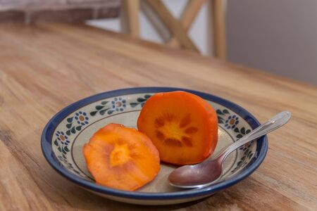 Juicy Persimmon in Plate on Kitchen Table Copy Space