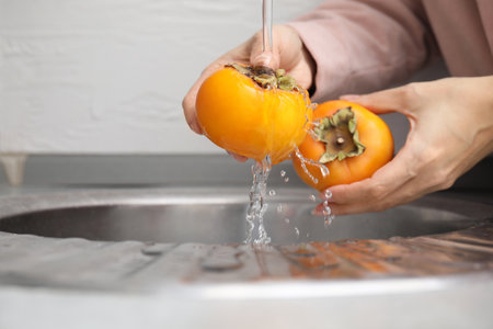 Woman washing delicious ripe juicy persimmons under tap water indoors, closeup