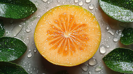 A fresh melon slice showcases a vibrant orange color with intricate patterns, surrounded by lush green leaves and glistening water droplets on a light background.