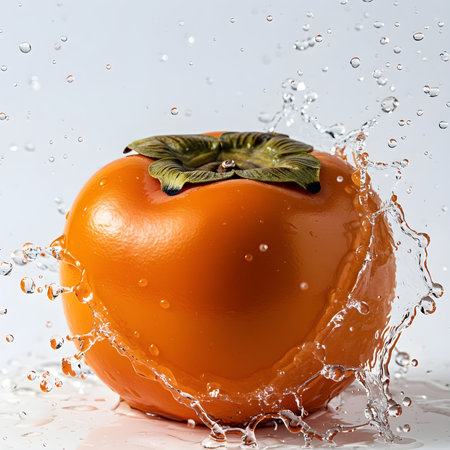 Close up of a persimmon, white background, water splashing, moist and watery, detailed