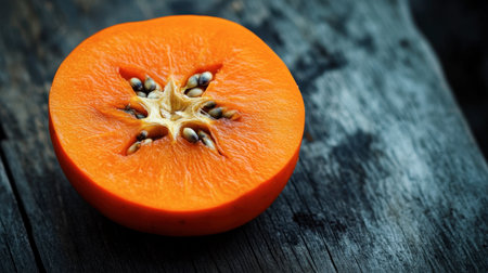 A close-up of a sliced persimmon showing its star-shaped seed pattern, resting on a dark wooden surface, highlighting its vibrant orange color.
