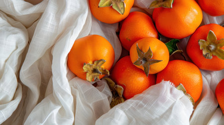 A captivating arrangement of fresh ripe persimmons resting on soft white fabric, presenting a cozy autumn vibe. Perfect for seasonal food photography.