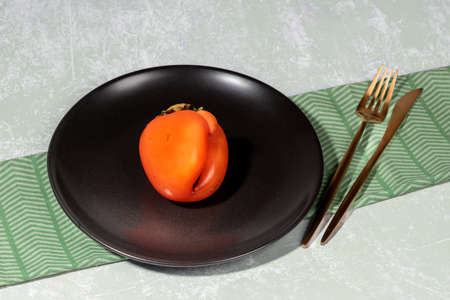 One ugly orange persimmon on black plate and golden cutlery on napkin on light backdrop. Zero waste food. Fresh healthy fruits. Reasonable sustainable consumption. Persimmon - source of vitamins.