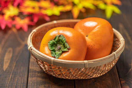 ripe persimmon fruits in a basket on wooden table with copy space