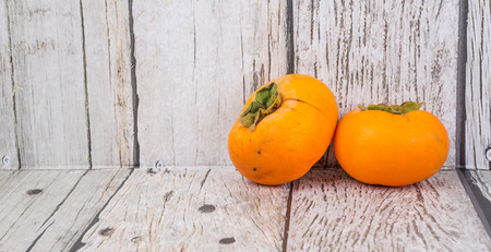 Persimmon fruit on old wood with blur bokeh background