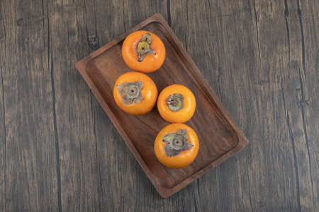 Ripe persimmon fruit on a wooden background. Top view.