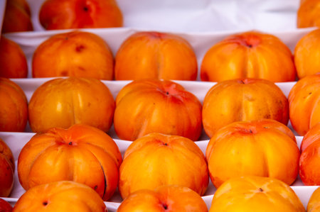 Fresh persimmons are available for sale in the store. Rich in vitamins and nutrients. Juicy and delicious fruity option. An exotic flavor perfect for the fall harvest season.