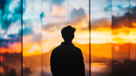 A striking silhouette of a man standing against a vibrant sunset, creating a serene and contemplative scene.