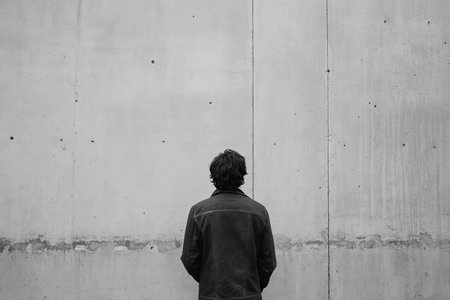 A person in a green jacket and beanie stands still facing a textured concrete wall. The setting appears urban and minimalist.