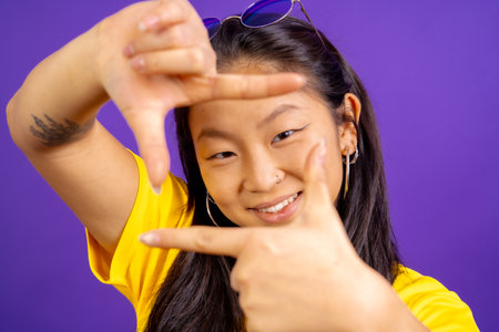 Studio photo with purple background of a chinese woman smiling and framing with hands