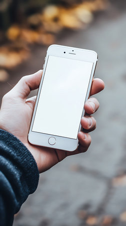 This image features a hand holding a white smartphone with a blank screen outdoors. Perfect for mobile app presentations and responsive design mockups.