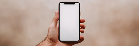 Close up of a hand holding a modern smartphone with a blank white screen, perfect for showcasing mobile apps or designs against a blurred, neutral background