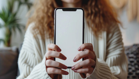 Mock up phone in woman hand showing white screen. Mockup template design. Generative AI art