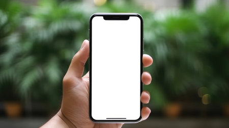 A hand holds a modern smartphone with a blank white screen. The phone is positioned against a blurred background with green plants. creating a clean and modern aesthetic. Perfect for showcasing mobile apps. websites. or designs.
