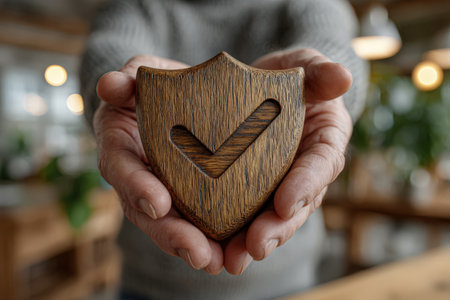 Hands holding wooden shield featuring checkmark symbol, conveying themes of security and trust in a warm, inviting indoor space with greenery and soft lighting