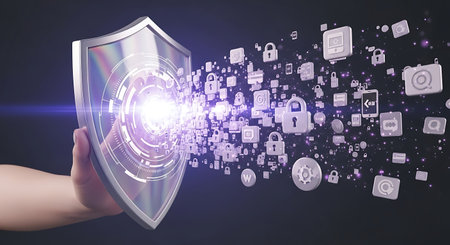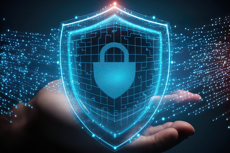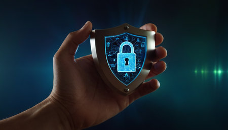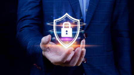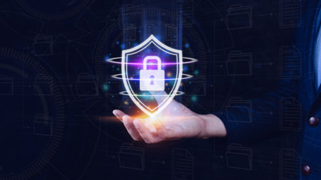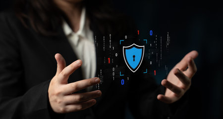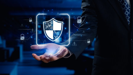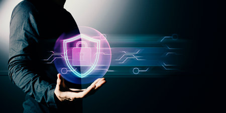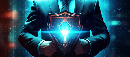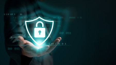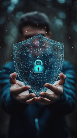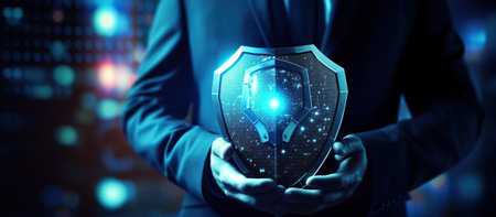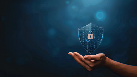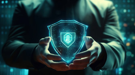 A professional hand holds a digital shield symbolizing robust cybersecurity against online threats, emphasizing the importance of protection in today digital landscape.