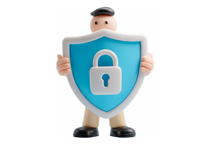 business character showing a shield with a padlock, symbolizing cybersecurity, data protection, and online safety.
