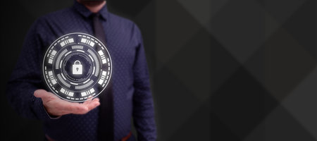 A virtual shield lock icon with the correct sign appeared on the human's hand on dark background with copy space. Cyber security, data protection, business privacy technology concept.