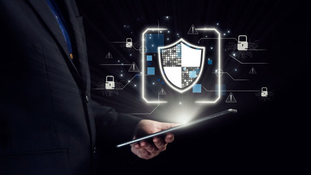 A businessman holds a tablet with a glowing digital security shield icon, symbolizing concepts of cybersecurity and data protection on an abstract dark background.