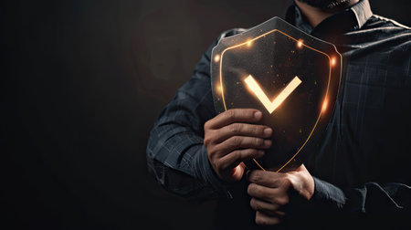 A man holds a shield featuring a bold tick symbol, signifying protection and approval, showing his readiness for success.