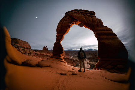 Hiker exploring a scenic desert canyon with a creek flowing under a magnificent double arch. Ai generated image