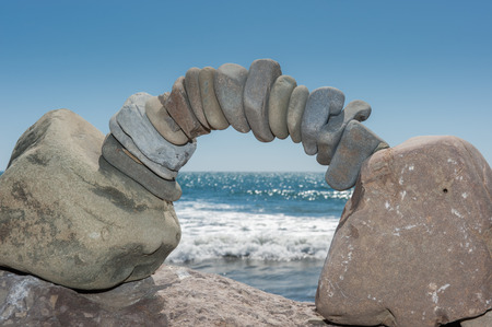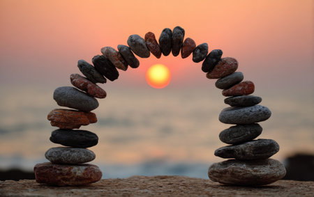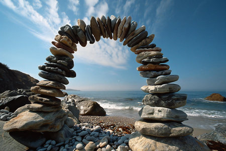 Photo of a balanced arch made from stones on the beach, symbolizing balance and harmony. Web banner with copy space to the right, captured with a wide-angle lens in soft daylight. --ar 22:15 --v 6.1 Job ID: 48f65059-3b30-4bc2-a9fd-1c171bfd109c