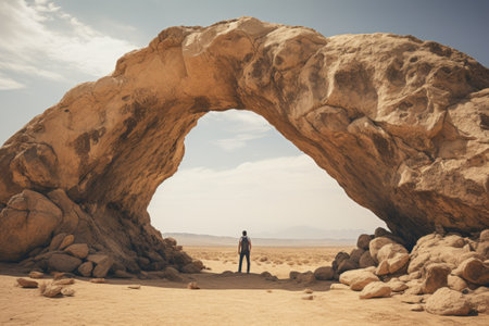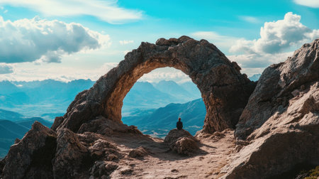 A serene scene featuring an individual seated under a natural stone arch, gazing at the stunning mountain landscape and vibrant blue sky.