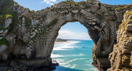 A large stone arch dominates the scene, framing a view of the ocean. The natural rock formation displays textured details and warm earthy tones. The composition includes the sea and sky, bathed in daylight, suggesting an outdoor setting. This image is suitable for various commercial uses.