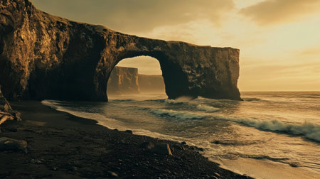 A stunning coastal landscape featuring a natural rock arch at sunset. Gentle waves wash ashore, creating a serene scene bathed in golden light.