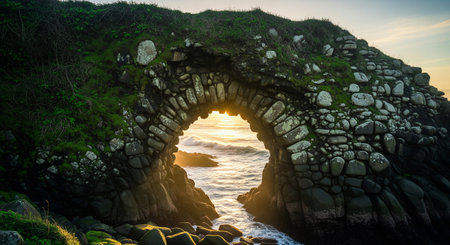 Golden Light from the Sea Shining Through a Round, Rocky Natural Arch on a Dark, Mossy Coast