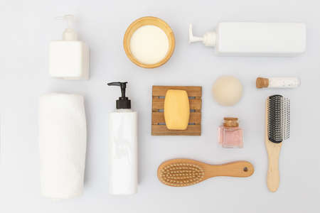 Spa bathroom products. Soap bar, toothbrush, shower ball sponge, shampoo bottle on white background. top view, copy space