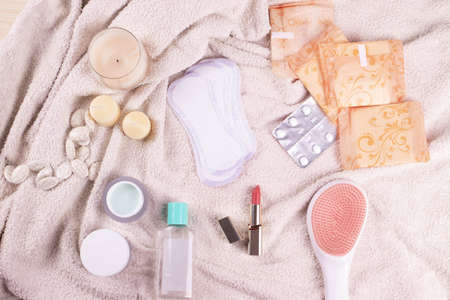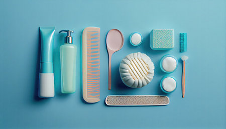 Mockup for bathing products top view flat lay, spa razor, toothpaste, soap, gel and other various accessories. Cosmetics for skin health.