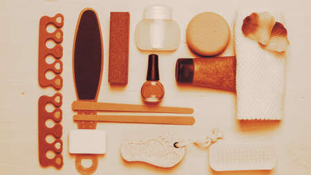 Foot care. Pedicure accessories set tools on wooden board background top view with copy space