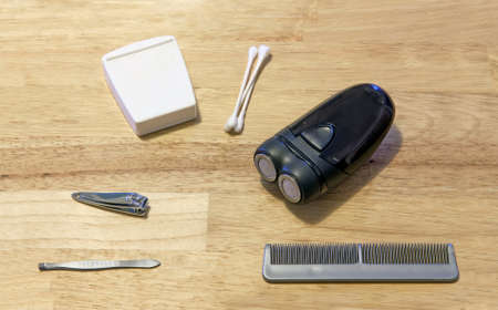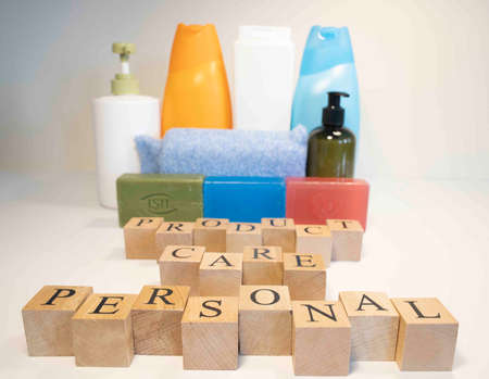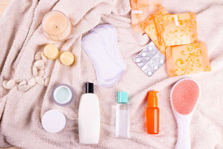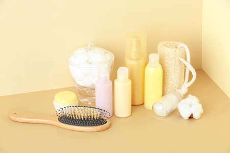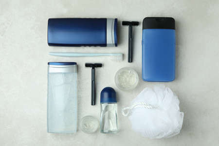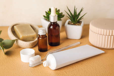 Composition with bath cosmetics on table. razor, toothpaste, soap, gel, toothbrush, mouthwash and other various accessories. Cosmetics for skin health.